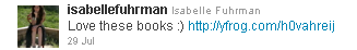 Josh Hutcherson, o Peeta, afirmou em sua entrevista para a EW que leu toda a série em apenas 5 dias. E agora foi a vez da atriz Isabelle Fuhrman, a Clove, mostrar seu fascínio pelos livros. Ela publicou em seu Twitter uma foto em que aparece lendo Jogos Vorazes, juntamente com uma frase em que afirma “amar esses livros”.