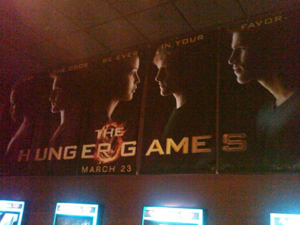 Uma fã de Jogos Vorazes (@monkeybymyself) twittou uma foto dos pôsteres em um cinema onde trabalha, nos Estados Unidos. Na foto, temos os posteres da Rue, Cato, Katniss, Peeta e Gale lado a lado, formando um poster maior. Quando eles serão exibidos em nossos cinemas?
