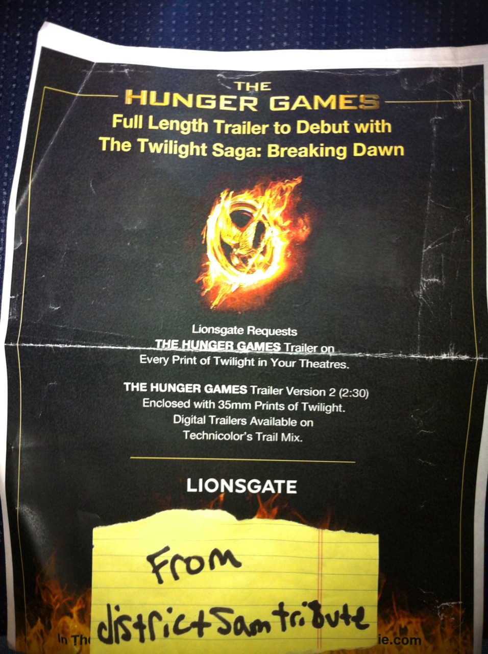 Durante a madrugada de hoje, um fã no Tumblr divulgou uma foto de um curioso cartaz. O cartaz, possivelmente da Lionsgate, exige que nas cópias de Amanhecer, penúltimo filme da série Crepúsculo e que chega aos cinemas mundiais dia 18 de novembro, tenha o trailer de Jogos Vorazes. A notícia deve ser tratada como um rumor, apesar do fã negar que esteja brincando. Você pode ver a foto neste link.