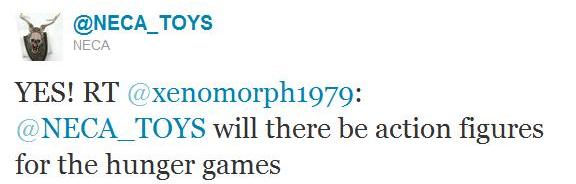 Pelo twitter, a NECA confirmou para um fã que haverá sim os bonecos, então agora só nós resta esperar e torcer para que haja bonecos do Peeta, Gale e Rue.