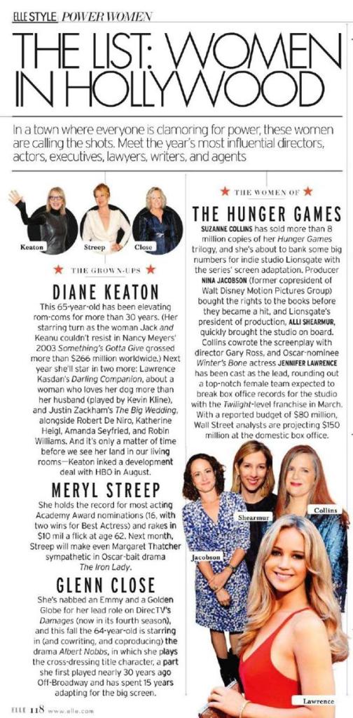 A edição de novembro da revista Elle trás uma matéria sobre as Mulheres de Hollywood, e imagina só quem ganhou lugar nessa matéria? Sim! As mulheres de Jogos Vorazes! A nossa queridíssima autora Suzanne Collins, a estrela de Jogos Vorazes, Jennifer Lawrence, a produtora do primeiro filme da série, Nina Jacobson, e Alli Shearmur, da Lionsgate. Veja o scan da página da revista aqui!